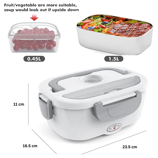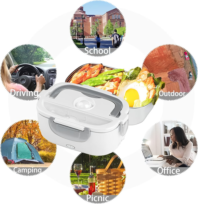 Τα 2 αφαιρούμενα διαμερίσματα PP διατηρούν το κύριο και το συνοδευτικό σας πιάτο χωριστά – και τα δύο μπαίνουν κατευθείαν στο πλυντήριο πιάτων μετά. Λειτουργεί στο γραφείο, στο αυτοκίνητο, σε εργοτάξιο ή σε οποιοδήποτε δωμάτιο με πρίζα.