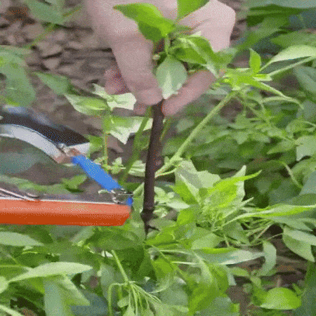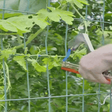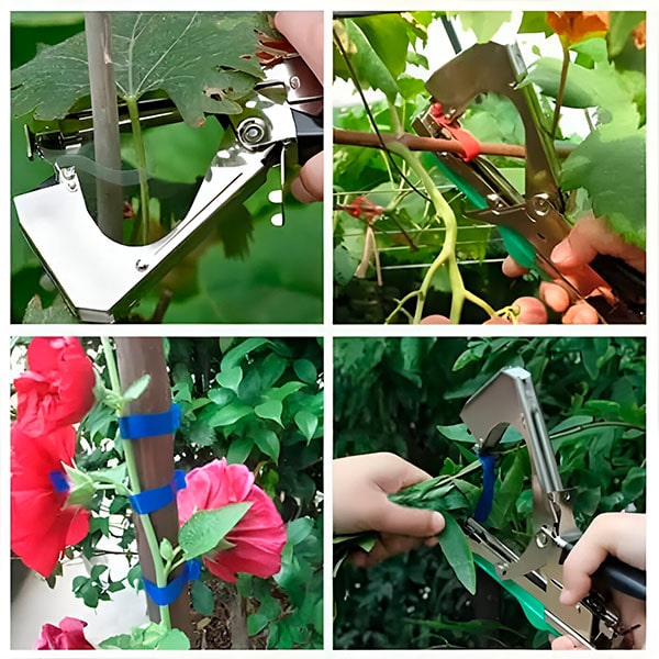 Απλώς πιέστε τη λαβή για να τεντώσετε τον ιμάντα ανάμεσα στις λαβίδες. Στη συνέχεια, η ταινία τυλίγεται γύρω από το φυτό που θέλετε να δέσετε. Σπρώξτε ξανά τη λαβή για να σφίξει και κόψτε την κορδέλα. Πολύ εύκολο! – μην ανησυχείτε μήπως καταστρέψετε τα φυτά σας ή τους προκαλέσετε πόνο, καθώς η ταινία και το συρραπτικό παρέχουν απαλό αλλά σταθερό κράτημα.