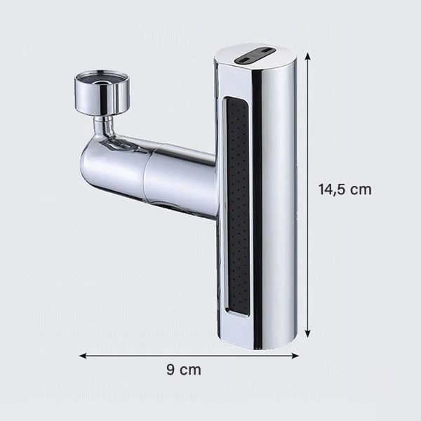Υλικό: σώμα από πλαστικό ABS + ορειχάλκινο εξάρτημα Διαστάσεις: 14,5 x 9 cm Λειτουργίες ψεκασμού: 3 (δέσμη, αεριζόμενη ροή, ομίχλη) Περιστροφή: 360° Συμβατότητα: ταιριάζει στις περισσότερες τυπικές βρύσες (δείτε το εγχειρίδιο για τις προδιαγραφές σπειρώματος) Χρόνος τοποθέτησης: κάτω από 30 δευτερόλεπτα Απαιτούμενα εργαλεία: κανένα